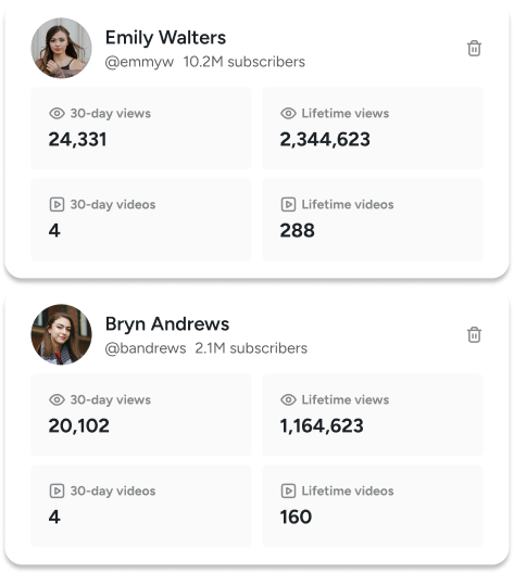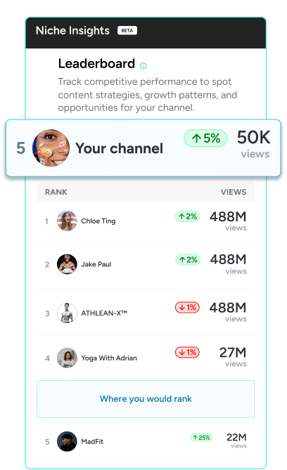 With Channel Benchmarking, you can compare your performance against similar creators in your niche. See how your views, subscribers, and engagement metrics stack up, and identify areas where you can improve. Gain valuable insights into what’s driving success for others and apply those lessons to your own channel. Growth has never been this clear.