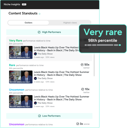 Content Standouts identifies videos in your niche that perform significantly better than expected. By analyzing these breakout videos, you’ll learn what topics, formats, or strategies resonate most with audiences and how to replicate that success.