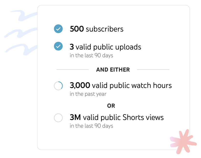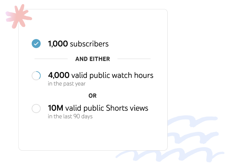 AND - Either 4,000 valid public watch hours in the past 12 months OR 10 million Shorts views in the last 90 days