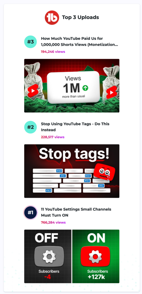Next, your YouTube channel year in review pulls up your top three uploads of 2024 along with total view count. These are your top-performing videos of 2024… and there are lessons to be learned from these outliers.