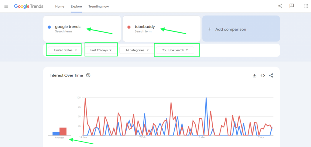 Simply enter your competitors’ keywords alongside yours to compare search interests and see where you stand in relation to them. Analyze the data to identify areas where they outperform you, such as topics or keywords they are using that you are not. Use this information to create similar, more unique, valuable content to attract your audience’s attention.