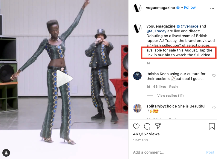 - Add a call-to-action. Everyone’s doing it, so should you – when promoting your video on Instagram, add a simple call to action like “Watch the full video – link in bio” or “Visit our YouTube channel for more awesome content”.