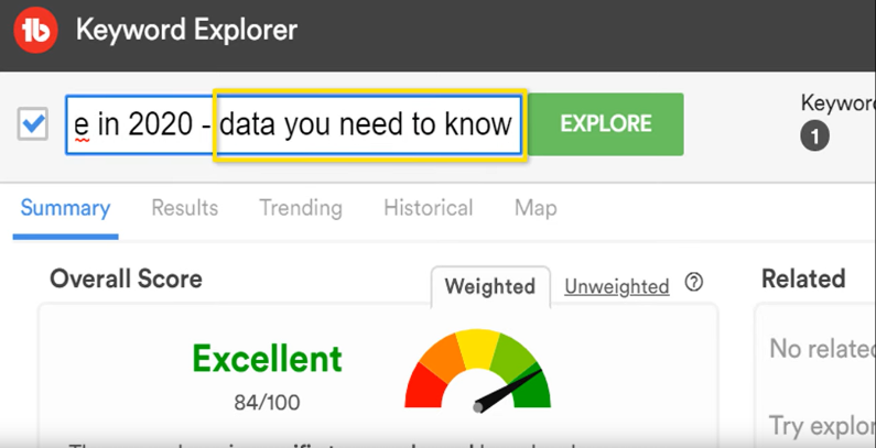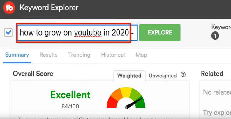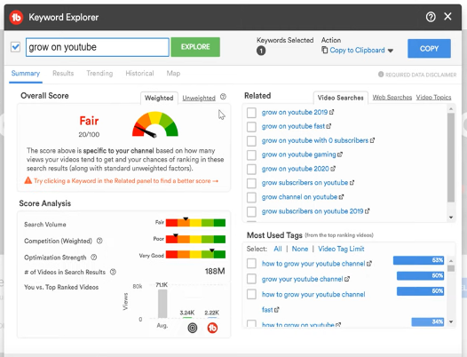 Using TubeBuddy’s Keyword Explorer tool will give you a good jumping off point. For this example, we typed “grow on YouTube” as our keyword. Within the weighted score tab, you will find lots of valuable information. *Note that in order to access the weighted score, you will need a Pro or higher level license.