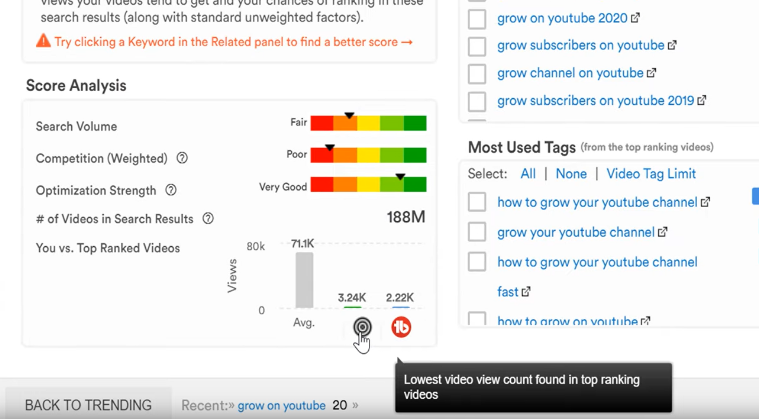 An important section to look at is the “You vs. Top Ranked Videos” section. This tells you how many views on average you’ll need to show up on the first page of search results. If that number is higher than your average views you should modify your term.