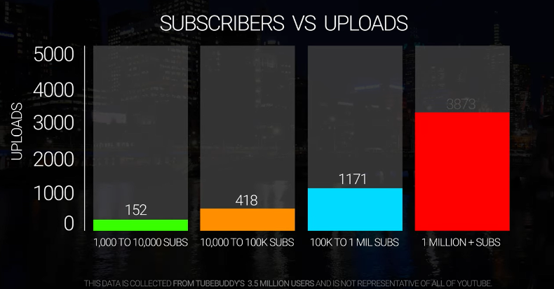 Here at TubeBuddy, we have access to 3.5 million YouTube users in our database. After examining the data, here are some important statistics for you to know. For channels with 1,000-10,000 subscribers there is an average of 152 uploads. Channels with 10,000-100,000 subscribers averages 418 uploads. Channels with 100,000 to 1 million subscribers averages around 1171 uploads and the channels with 1 million or more subscribers average 3873 uploads.