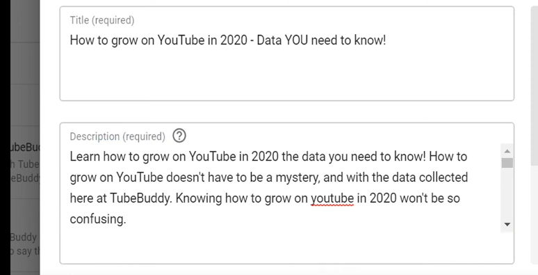 So we’ll modify again and change our keyword to “how to grow on YouTube in 2020 – data you need to know.” This title does two things that YouTube recommends. It is a title that is both searchable and compelling. In this example, the searchable part of the title is “how to grow on YouTube”