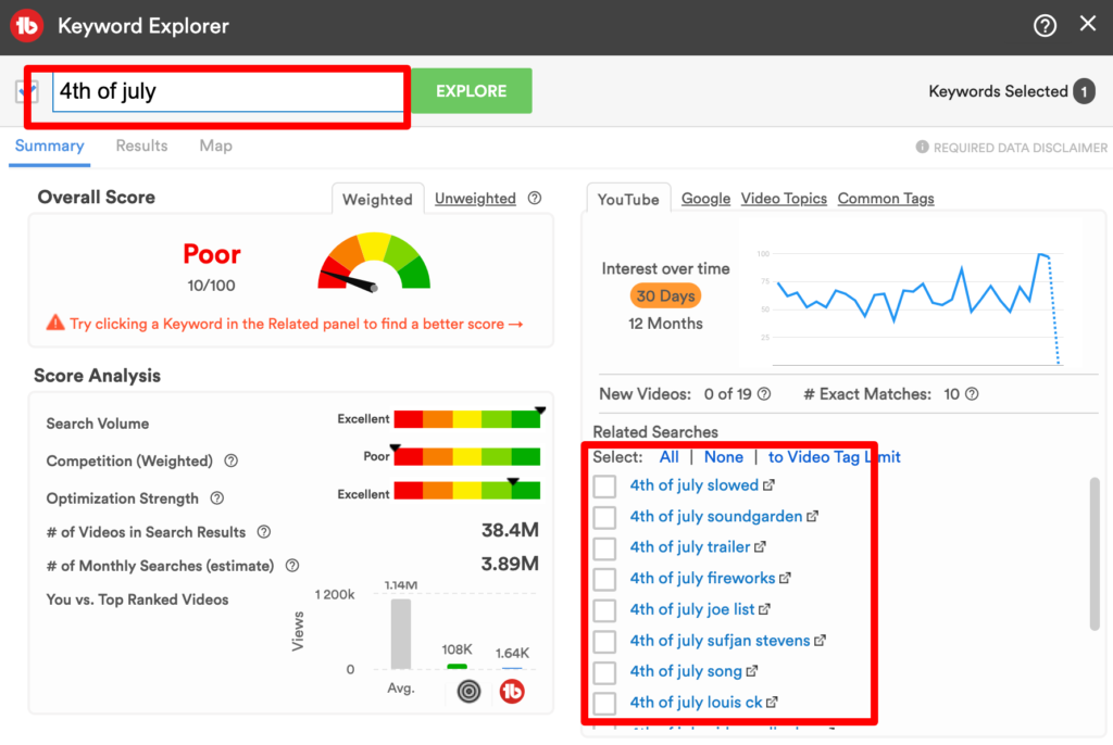 The term “4th of July” has a very high search volume but is highly competitive and may be almost an impossible target to rank highly for if you’re a new or small channel. However, you can dig into Related Searches to find a topic around July 4th that viewers are searching for but don’t have as much competition as the main keyphrase. You can also keep refining your search using the search box.