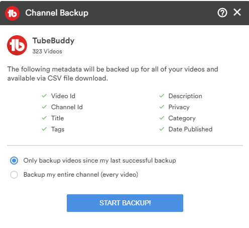 TubeBuddy’s Channel Backup allows you to back up all of your video’s metadata. This means that you can protect yourself against lost data. Losing data can affect the growth and revenue of YouTube creators’ channels. So, having a backup of your video metadata, such as titles, descriptions, tags, and thumbnails, gives you peace of mind and ensures that you can easily restore your data if needed.