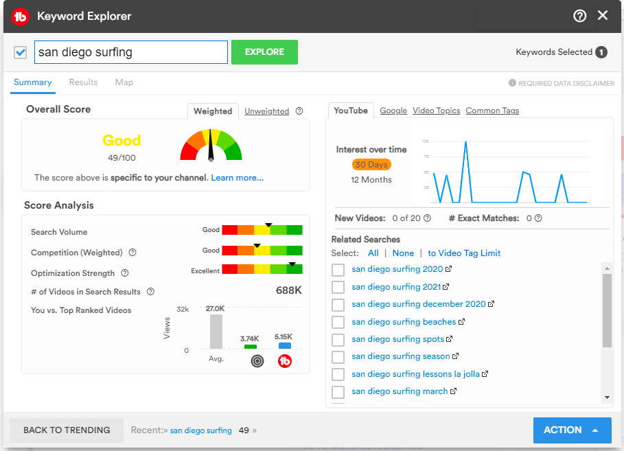 It also has a unique feature or snapshot analysis called “Keyword Score,” which rates the difficulty of ranking for a particular keyword. This makes it particularly useful for content creators focused on improving the SEO of their channel.
