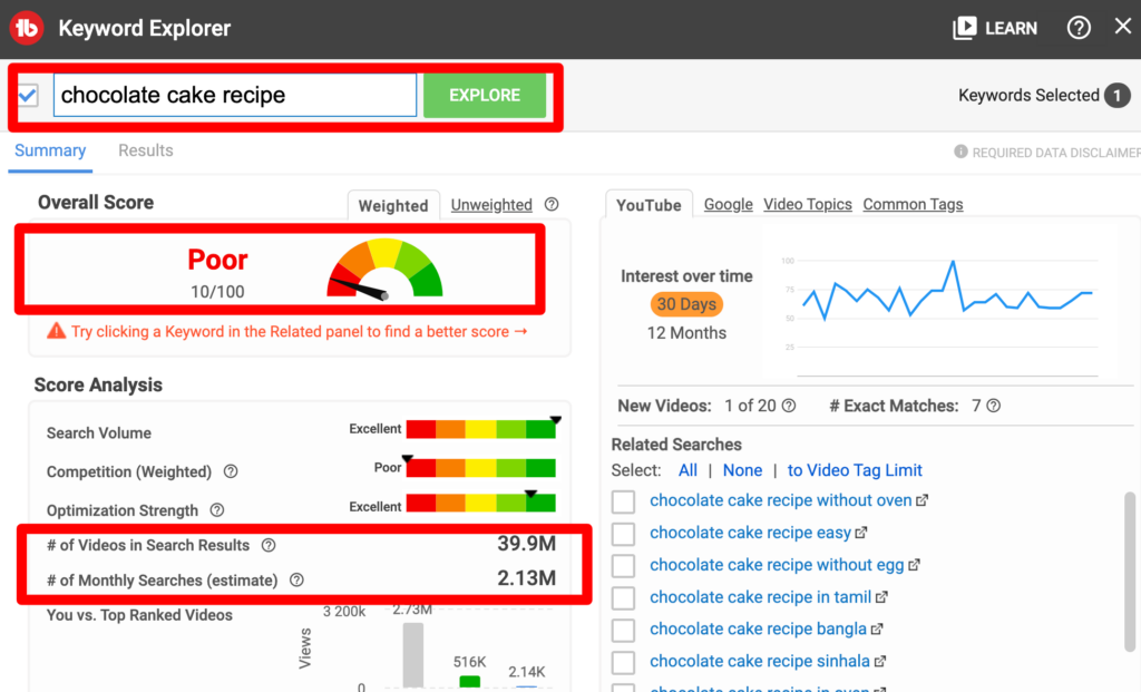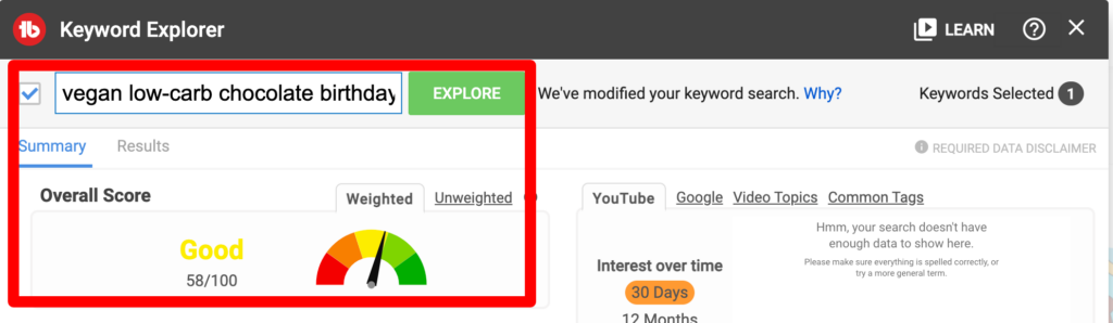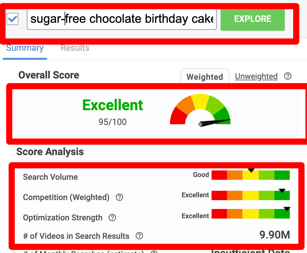 However, if you niche down and create a ‘vegan, low-carb chocolate birthday cake’ video, you boost your chances of search visibility. The score is now ‘Good.’ However, tweak that title even more to ‘sugar-free chocolate birthday cake’ and boom!