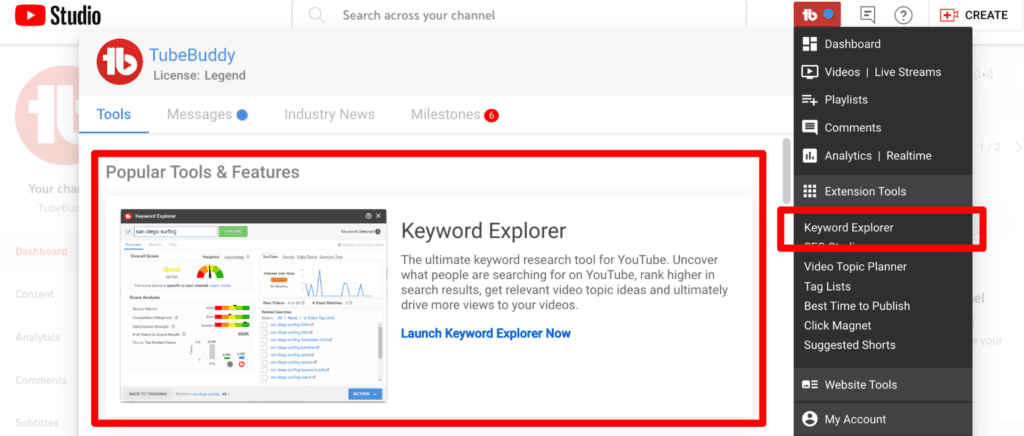Make sure you’re signed in to your TubeBuddy account on YouTube to access the tool. Then just open the dashboard and click on ‘Launch Keyword Explorer Now’ or Select Keyword Explorer from the TubeBuddy drop-down dashboard located in the top right corner.