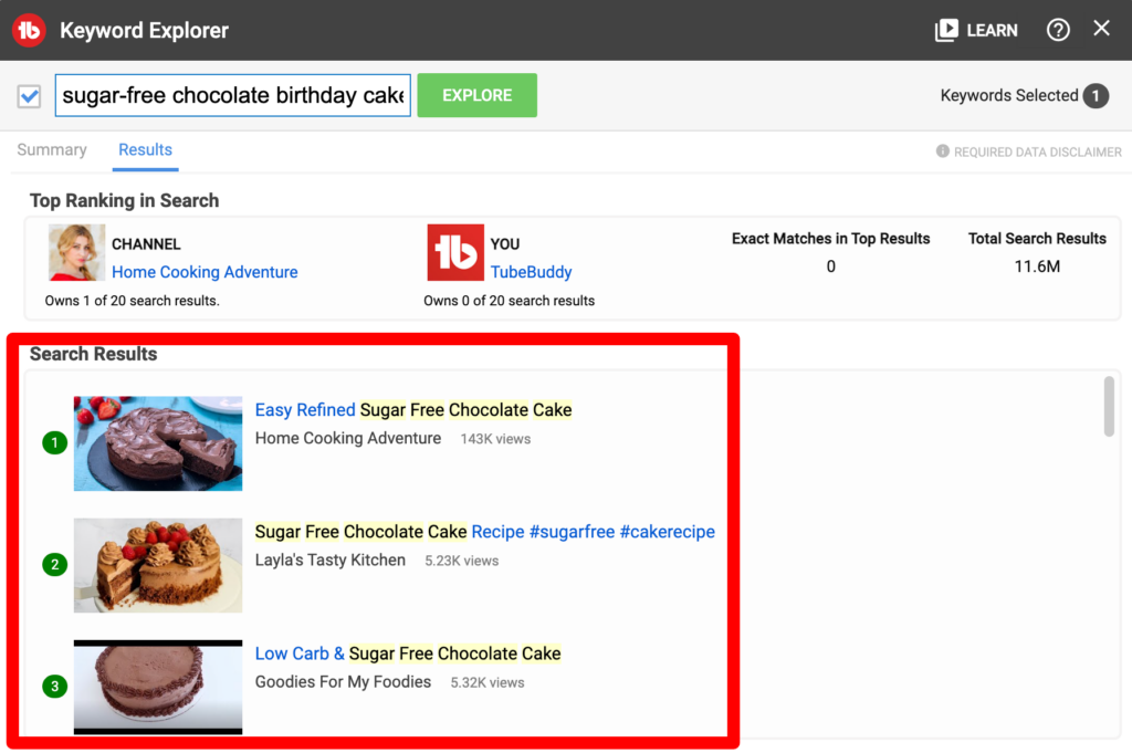The next step is to click on the ‘Results’ tab. From here, you can see the top 20 videos that are well-optimized for this target because those keywords, when they’re in the exact order, will be highlighted in bright yellow.