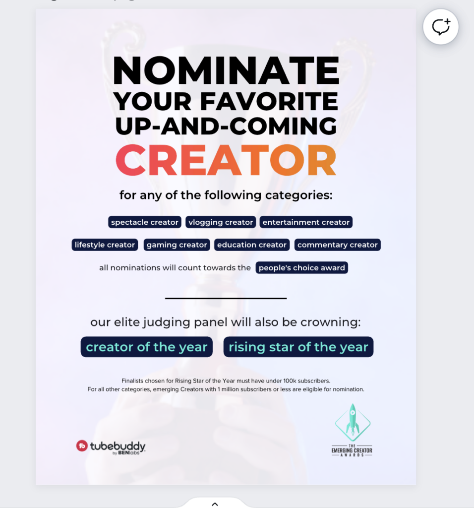 As part of our Creator Day 2023 celebrations, TubeBuddy and BENlabs want to know who you think the stand-out emerging content creators are right now. Nominating them for an Emerging Creator Award is your chance to say thanks for all that they do. You can vote for a creator in any of the following categories: