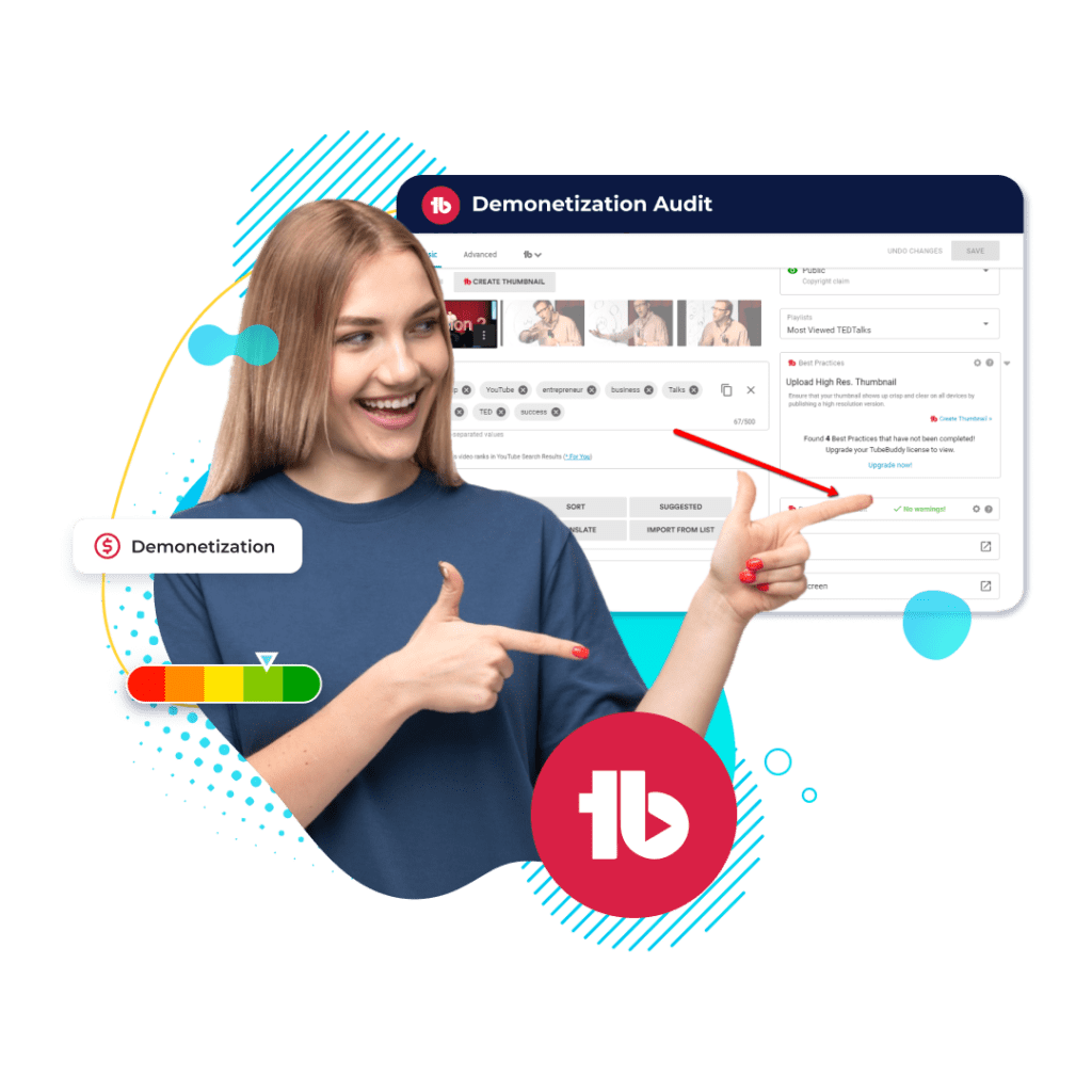 By running a quick scan through the YouTube demonetization audit tool, TubeBuddy detects red-flag terms in your metadata. Making edits based on its suggestions significantly reduces your chances of getting demonetized on YouTube.