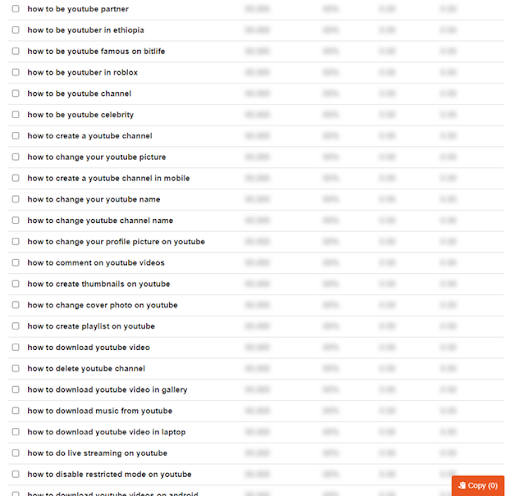 Another option for scaling your topic research is to use a tool called Keywordtool.io. Simply put in a broad keyword (e.g. “how to _ youtube” as in the image below)…