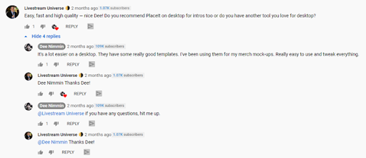 Engaging directly with your viewers and community pays dividends. When you engage people by replying to their comments, you validate them and might even earn a subscriber in the process.