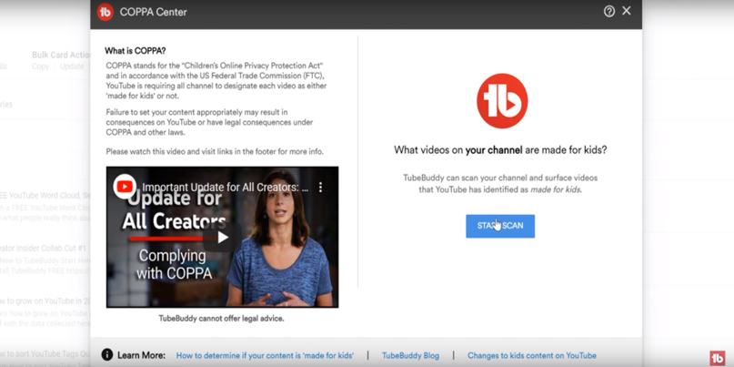 This section has information about COPPA, as well as the video that is linked at the beginning of this post. Simply click Start Scan and TubeBuddy will scan your videos at the rate of about 50 videos for every 2 seconds.