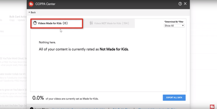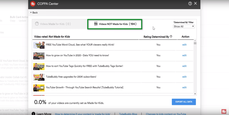 TubeBuddy can quickly scan your channel’s videos to see if YouTube had identified your videos as made for kids. Please remember, TubeBuddy doesn’t offer legal advice; we’re simply here to help you identify the videos that YouTube has marked as safe for kids.