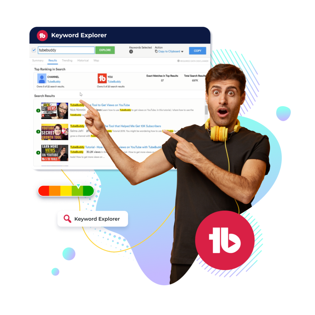 TubeBuddy’s Keyword Explorer tracks search trends and behavior from YouTube and Google data, helping you spot emerging and high-traction keywords.