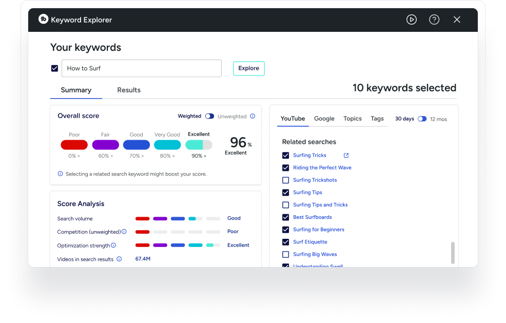 It offers detailed keyword scoring, trend tracking, related keyword suggestions, and insights into search volume and competition to guide your video SEO.