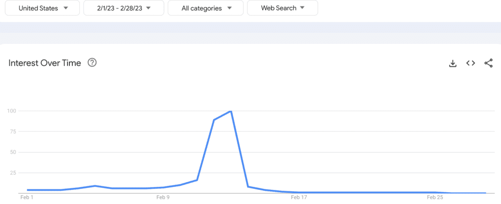 February 12th, 2023, was Super Bowl 57. 113 million people tuned in to watch the game. A quick look at Google Trends will show you that people were searching the internet, too (see below). The keyword ‘Super Bowl’ was trending and peaked the day after the game.