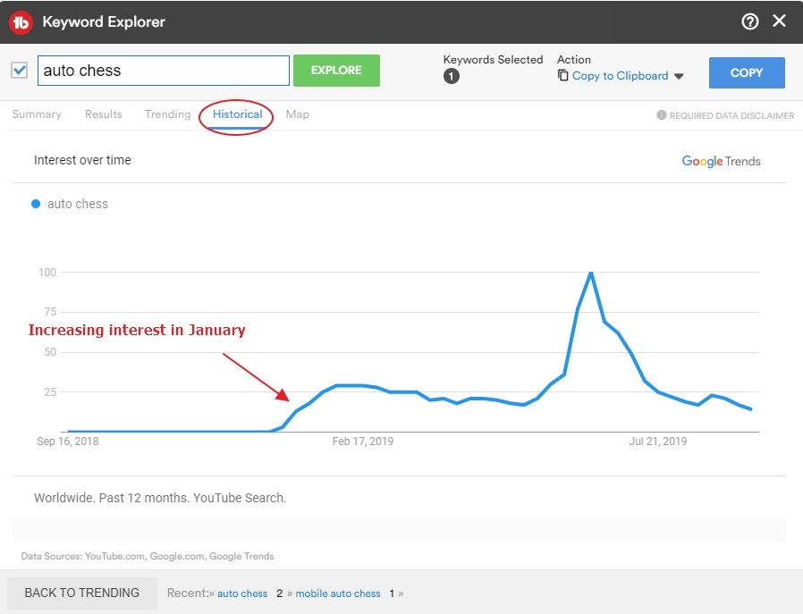 To confirm if this game was becoming popular outside of Dota 2, I used Keyword Explorer to see if it was worth my time to create a video about it. This would help me make sure enough people were interested in watching the video.When you look for historical data within Keyword Explorer, the tool will give you a score from 0 to 100 to tell you how popular a query has been for a given region and time. 100 is the peak popularity of the term, while 0 means there’s low search volume.