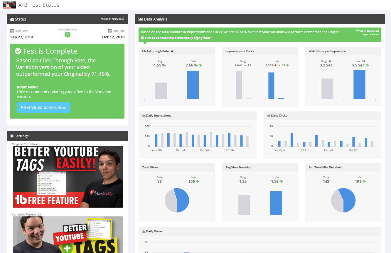 This feature is available in the Account Page. Here you will be able to select two thumbnails you want to test – the original (A) and the variant (B) – and you can choose how long you want the test to run. After you’ve set up the test, we will automatically switch your videos thumbnail from A to B every 24 hours. Once the test finishes, we compare the stats from each variant and report back our findings. Then you’ll have the option to choose which option you want to move forward with.