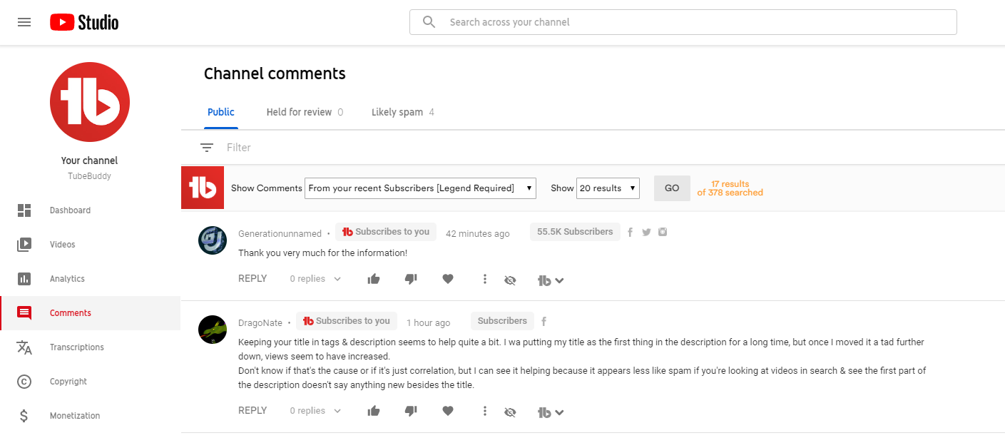 How do you know if the people under your comment section are your subscribers? Other than recognizing the same name and avatar, the only way is to search through your list. This can be tedious, especially when you have over a thousand subscribers. It can get even trickier if you have a Patreon and want to identify your Patrons. With TubeBuddy’s Comment Spotlight, we highlight your subscribers and Patrons, so you can identify them immediately. Easily distinguish comments so you can continue to build connections with your subscribers and patrons.