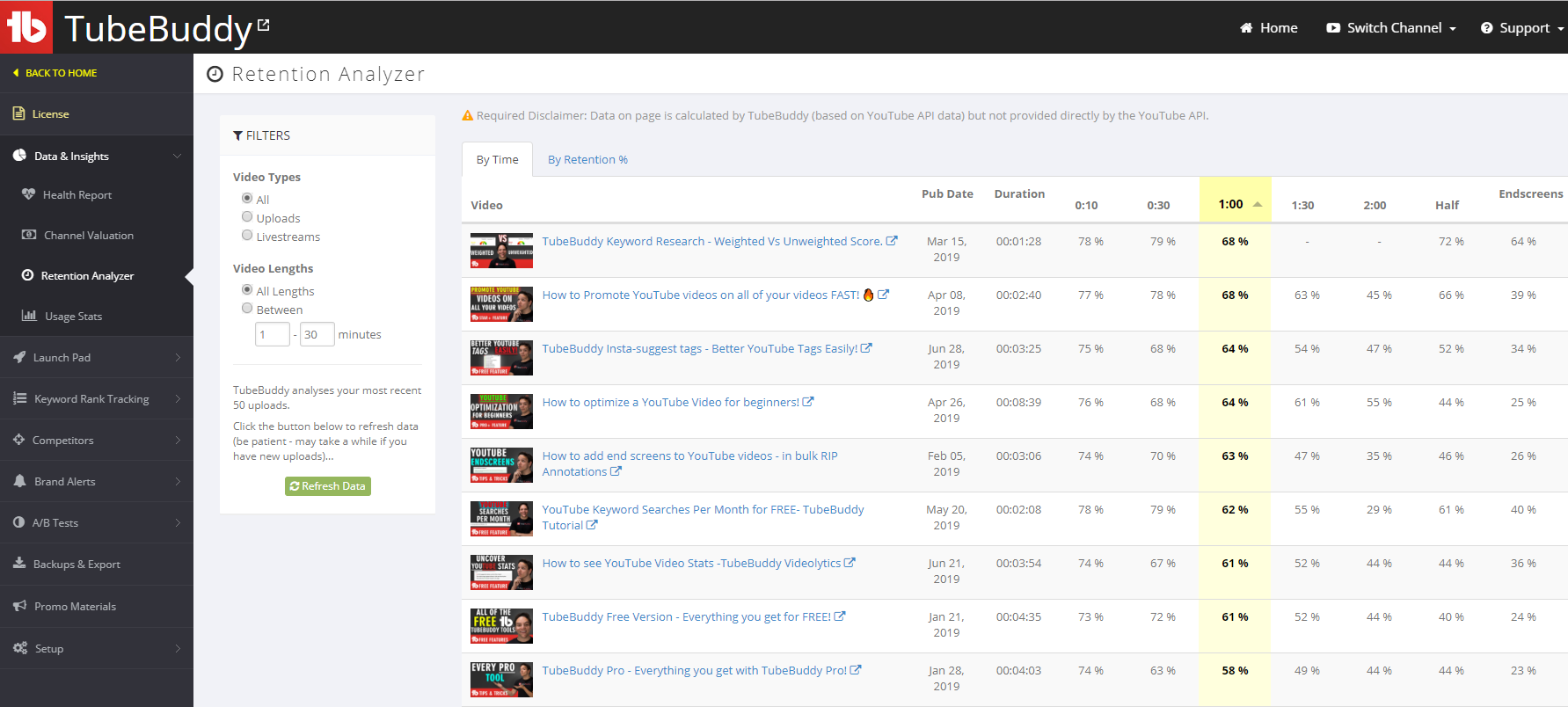 It is essential to know which of your videos are keeping viewers engaged and which might be driving them away. With TubeBuddy’s Retention Analyzer, you can see how your videos are performing across various time intervals. This can be extremely helpful to learn the percentage of people who make it to the one minute mark, halfway, or all the way to the end screen. You can find this tool on TubeBuddy.com.