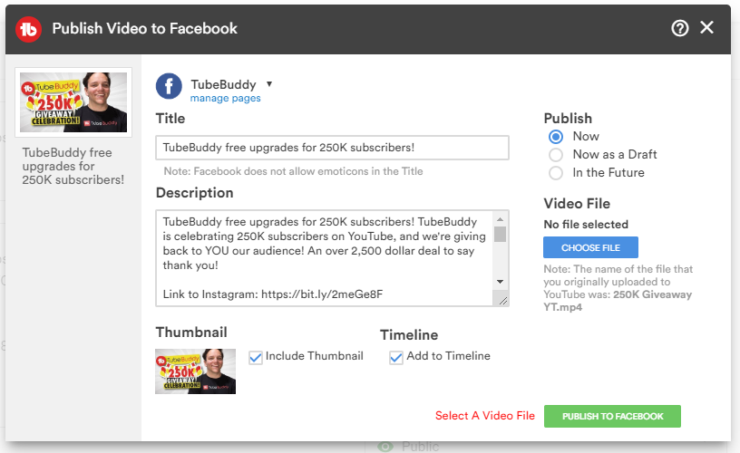 Even though it might take you a minute or two to do the three-step process, those minutes can add up. TubeBuddy takes your video and its metadata and publishes it to Facebook, all the while staying within YouTube’s domain.