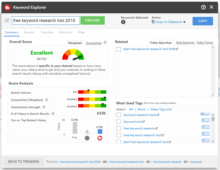 All TubeBuddy users have access to the Keyword Explorer and our many tag tools, however, Free users are limited to only three tags at a time. With a Pro license, you have unlimited access to these tools for researching to your heart’s content. You also get access to a keyword’s weighted score, which gives you insight into how a keyword can work specifically for your channel.