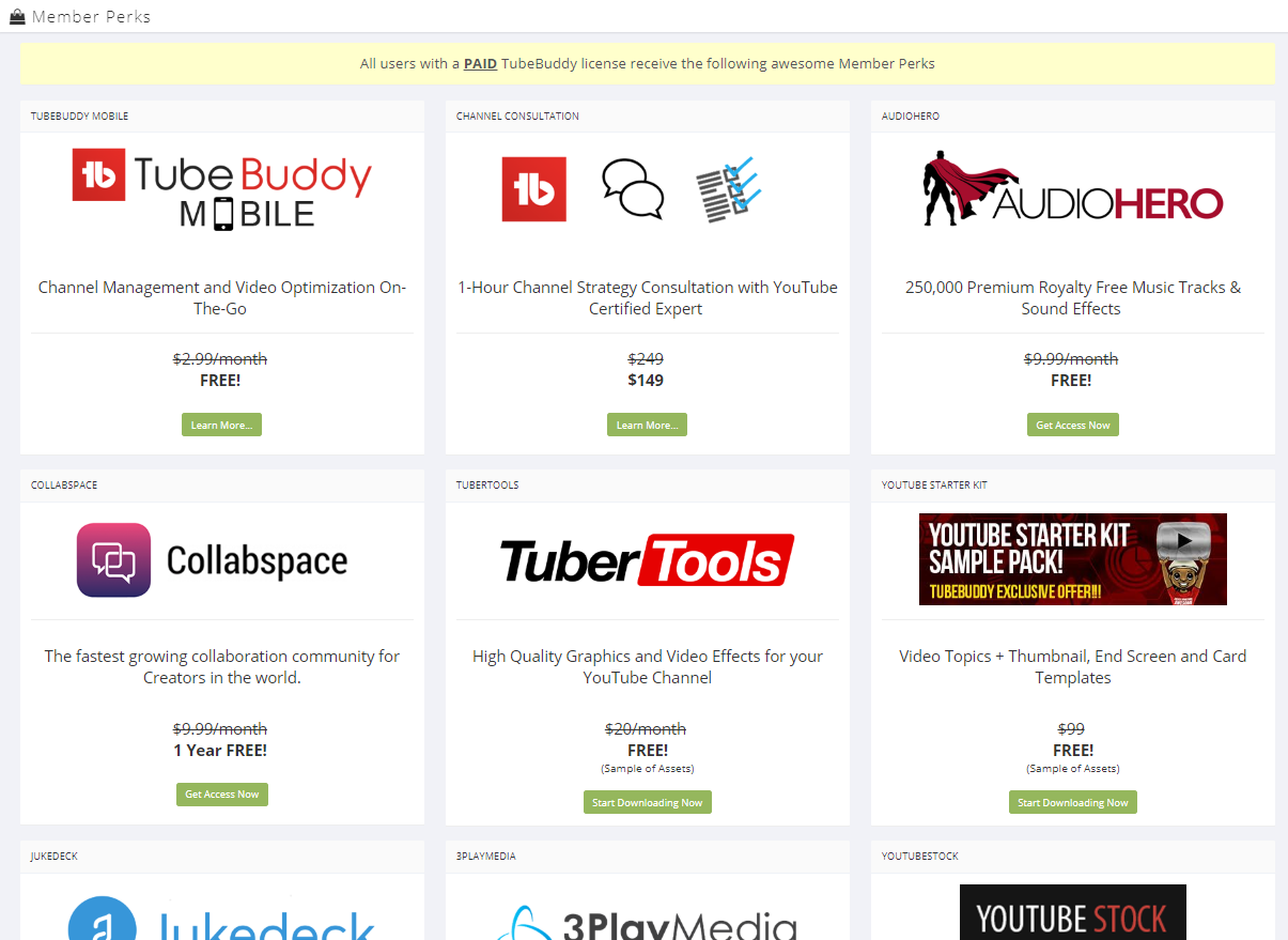 Along with the video optimization and productivity tools, the Pro license offers access to TubeBuddy Member Perks. Some of the perks, like free access to Nick Nimmin’s TuberTools or Roberto Blake’s Starter Pack, can be a great addition to help you increase productivity.