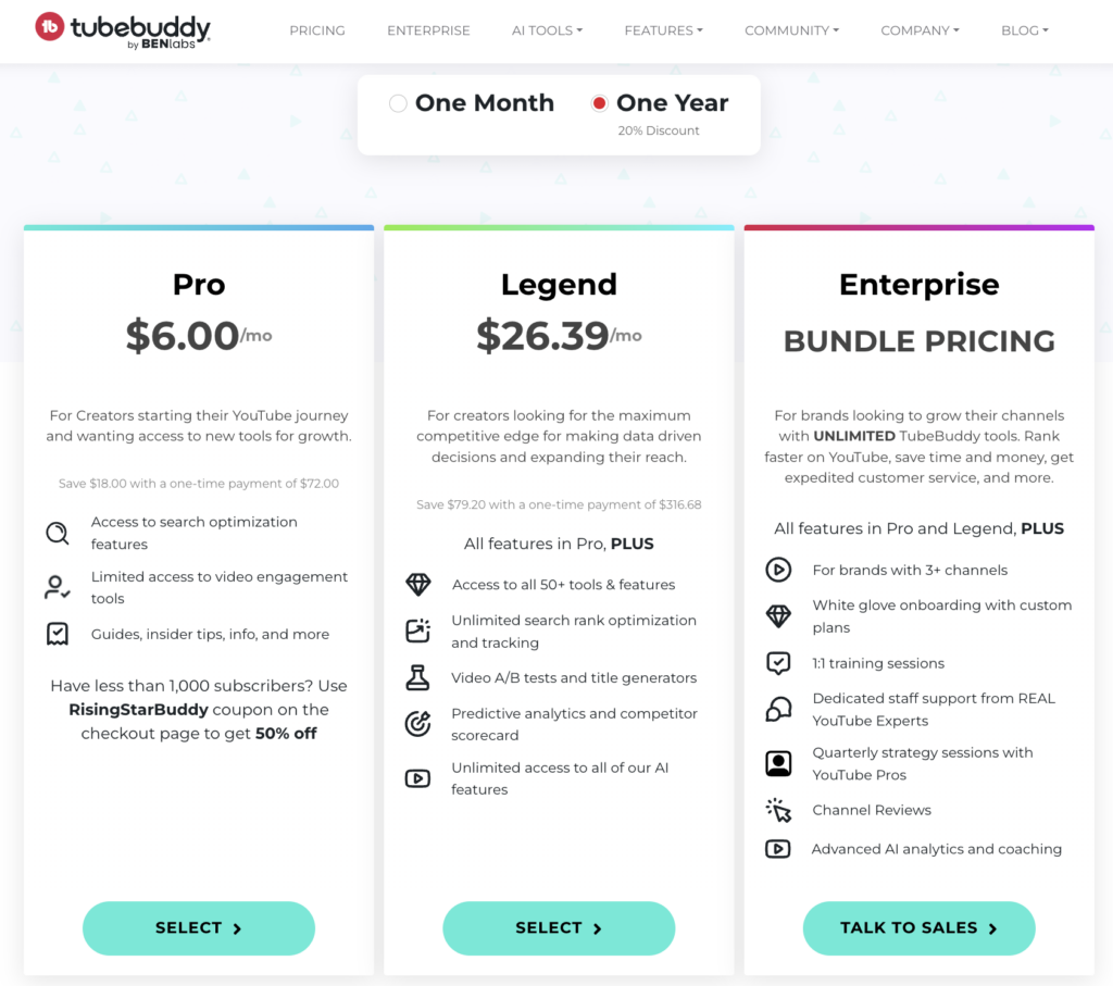 TubeBuddy offers three different pricing options: Pro, Legend, and Enterprise. The Pro plan is the most budget-friendly, with a starting price of $7.50/month if you choose to pay on a monthly basis. If you decide to pay annually, the price drops to $6.00/month, which is a discount of over 20%. You can find additional pricing information on this pricing page.
