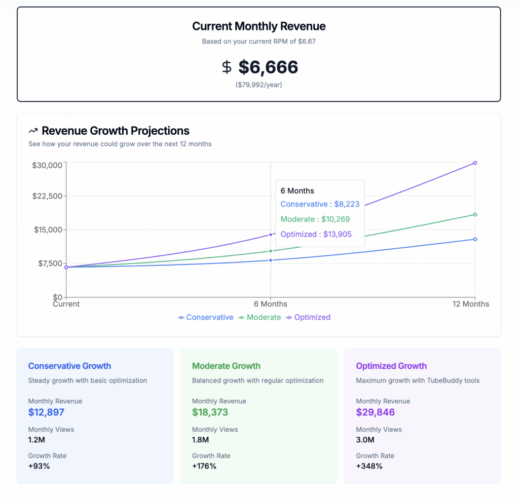 - Uses niche-specific CPM estimates so the projected earnings more closely reflect what advertisers pay in your content category.