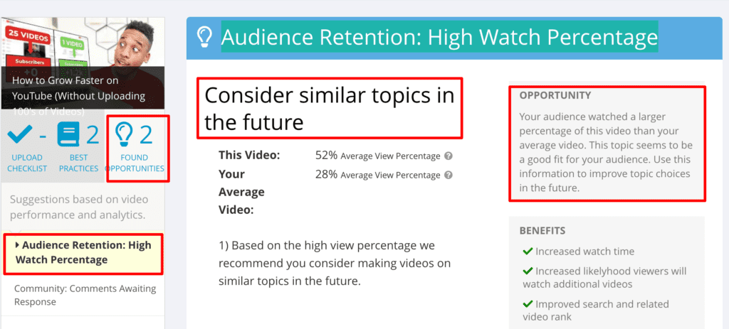 The Opportunity Finder is part of our ‘Video SEO’ suite of tools and can be extensively mined for suggestions regarding channel growth. These recommendations are based on your past video performance, so the data is exclusive to your channel.
