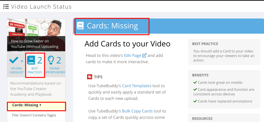 Before we open the ‘Found Opportunities’ tab, our ‘Best Practices’ check has picked up on the fact that our latest video doesn’t include any Cards (which we omitted for the purposes of this demonstration.)