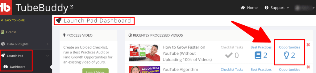 If we click on ‘Opportunities’ on the far right, a new dashboard appears with suggestions from TubeBuddy on how to proceed.