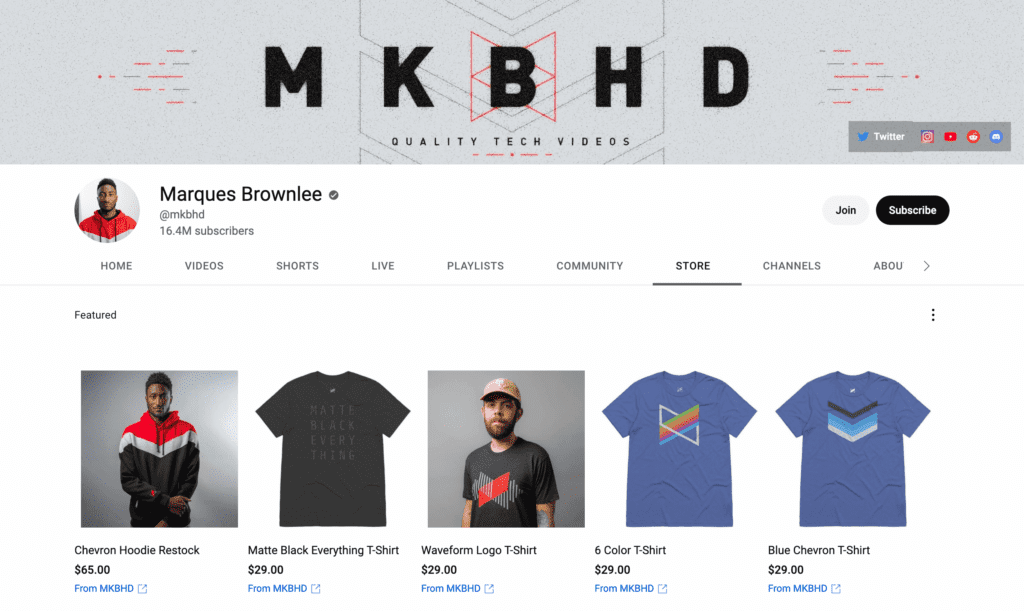 So, what should you sell in your shop? Stickers, shirts, makeup, puppets, online courses: You name it, you can sell it. With sites like Amazon and Bonfire offering services where they’ll craft and ship your designs for you, making simple merch is easier than ever. Don’t be afraid to get creative. Popular taglines or viral moments can make for great products, serving as inside jokes among your fanbase. And stay consistent to your brand. For example, tech creator Marques Brownlee’s YouTube store boasts consistent designs and color schemes that recognizably match his branding.